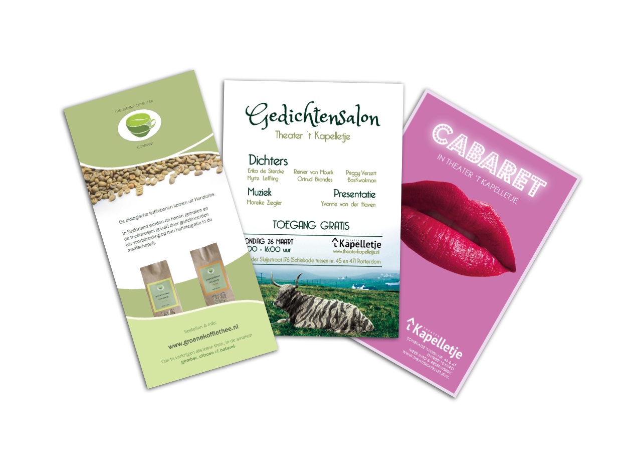 Met flyers, visitekaartjes en ander drukwerk combineer ik sterk beeld met bondige info. Naast het ontwerp help ik je kiezen tussen papierdiktes en hoeveelheden om het printklaar op te sturen.